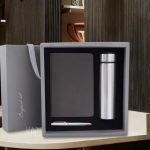 The products in the gift set include: notebook, thermos, ballpoint pen, gift box.