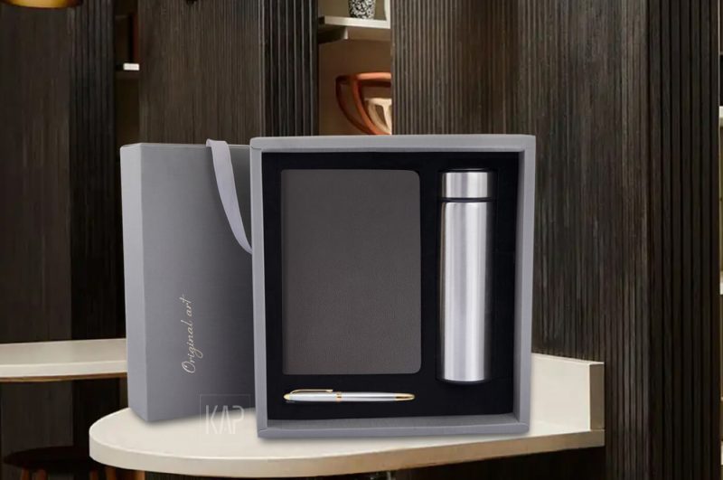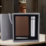 The products in the gift set include: notebook, thermos, ballpoint pen, gift box.