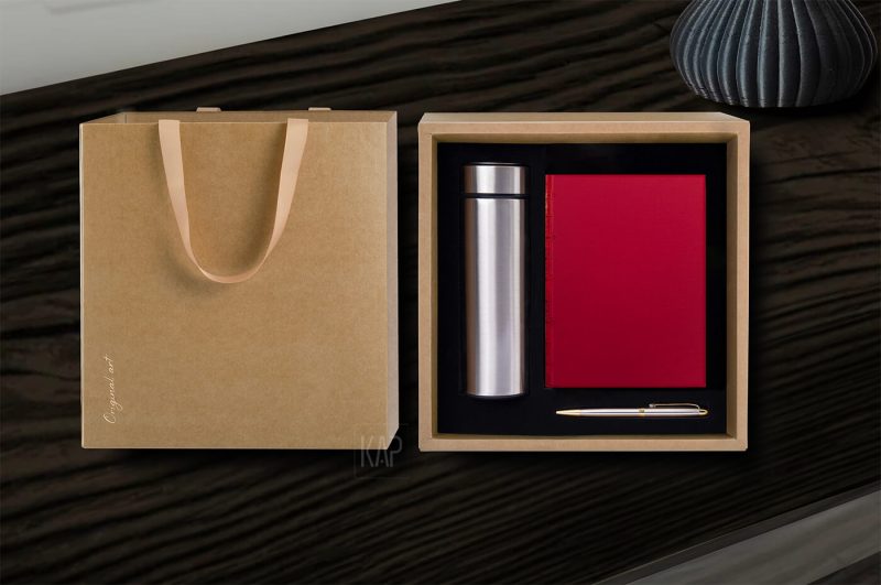 Các sản phẩm trong bộ quà tặng gồm có: sổ tay, bình giữ nhiệt, bút bi, hộp quà tặng.